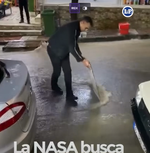 ...Un hombre cruza el agua de lluvia que fluye como un arroyo sobre el asfalto usando un método muy interesante