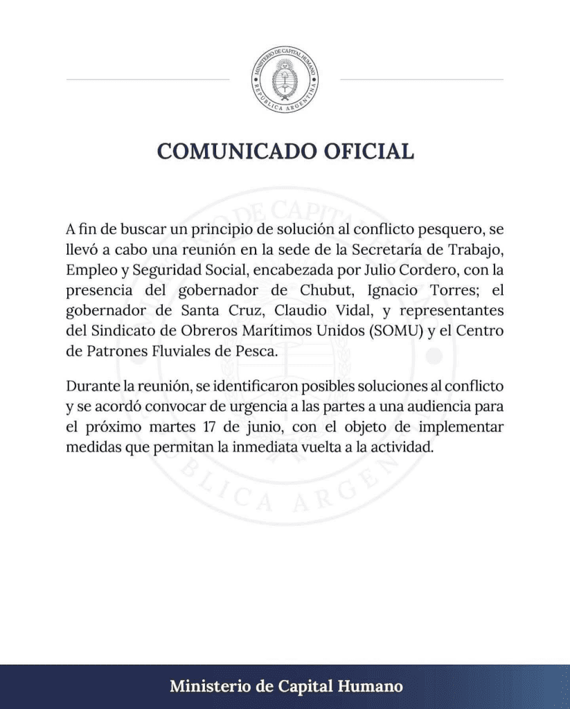 Por gestiones impulsadas por los gobernadores Claudio Vidal de Santa Cruz e Ignacio Torres de Chubut, el Gobierno Nacional convocó a una nueva mesa de trabajo prevista para el próximo martes 17 de junio, con el objetivo de avanzar en una solución al prolongado conflicto que afecta a la actividad pesquera.