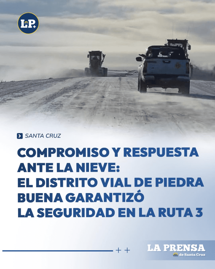 El Distrito Vial Piedra Buena informa que, tras las intensas nevadas registradas durante la jornada de ayer y la noche pasada, se llevó adelante un arduo operativo de despeje sobre la Ruta Nacional N° 3, en un esfuerzo conjunto para restablecer la circulación vehicular en condiciones de seguridad.