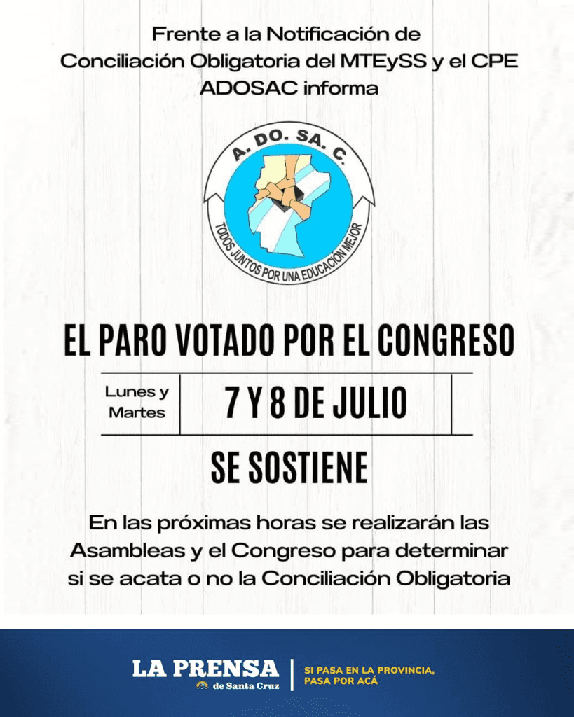 Frente a la notificación emitida por el Ministerio de Trabajo de la provincia, que dictó la conciliación obligatoria en el marco del actual conflicto laboral, la Asociación Docente de Santa Cruz (ADOSAC) informa a la comunidad educativa y a la opinión pública que mantiene la resolución adoptada en el último Congreso Provincial.
