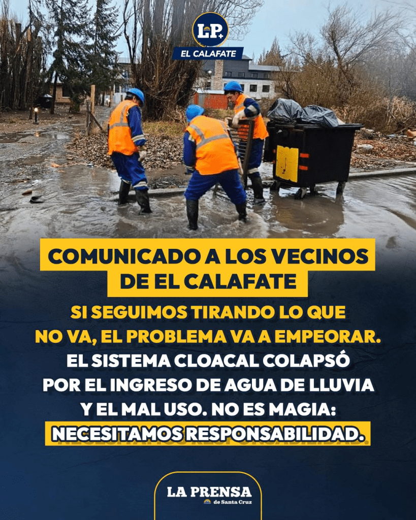 Ante la situación que atraviesa El Calafate por el desborde del sistema cloacal, producto del ingreso excesivo de aguas pluviales al sistema sanitario, se solicita a toda la población extremar las precauciones y colaborar para evitar mayores inconvenientes tanto en los hogares como en la vía pública.