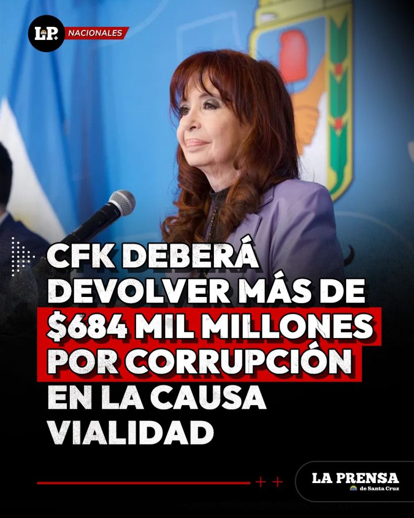 A un mes de que la Corte Suprema dejara firme la condena por corrupción en la causa Vialidad, el Tribunal Oral Federal N° 2 determinó que la expresidenta Cristina Fernández de Kirchner y otros ocho condenados deberán resarcir al Estado con más de 684 mil millones de pesos, monto que surge de la actualización por inflación, intereses acumulados y multas correspondientes.