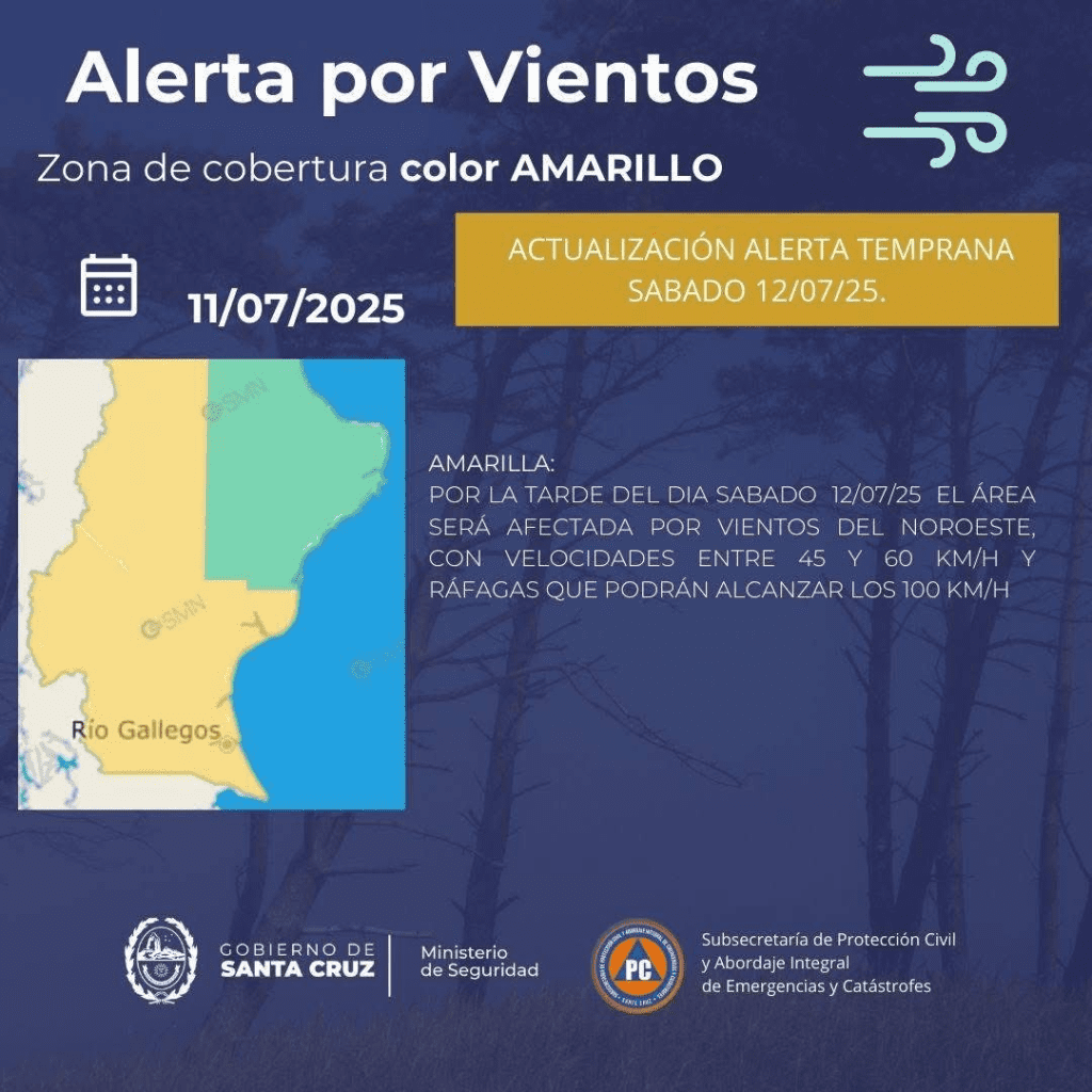 Se comunica a la población que el Servicio Meteorológico Nacional ha emitido una actualización de Alerta Temprana de nivel Amarillo por vientos intensos y lluvias para el día sábado 12 de julio de 2025, con afectación en gran parte de la provincia de Santa Cruz.
