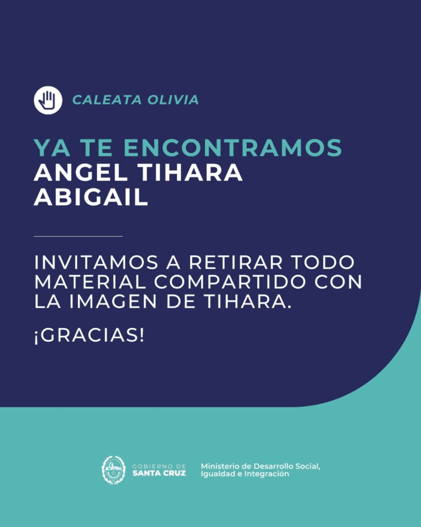 La Policía de la Provincia de Santa Cruz informa que Tihara fue encontrada y se encuentra en buen estado de salud, luego del operativo de búsqueda desplegado en coordinación con diversas unidades.