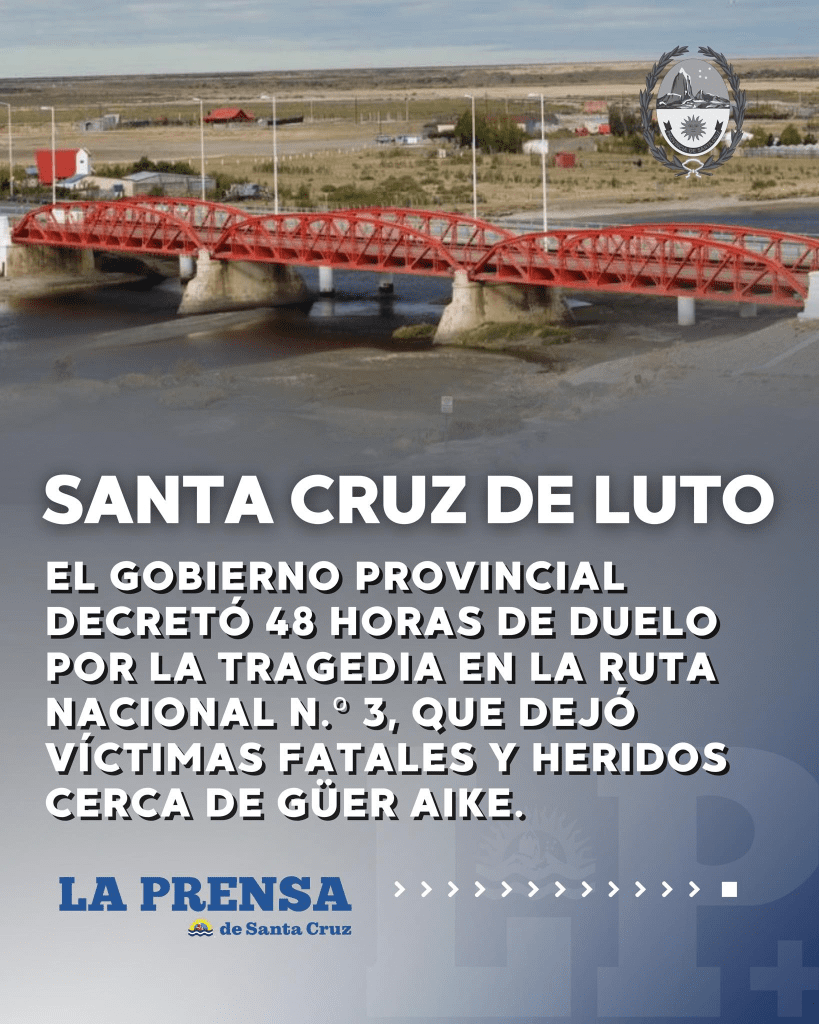 El Gobierno Provincial decretó 48 horas de duelo por la tragedia ocurrida en la Ruta Nacional N.º 3, a pocos kilómetros de Güer Aike, que dejó víctimas fatales y heridos.