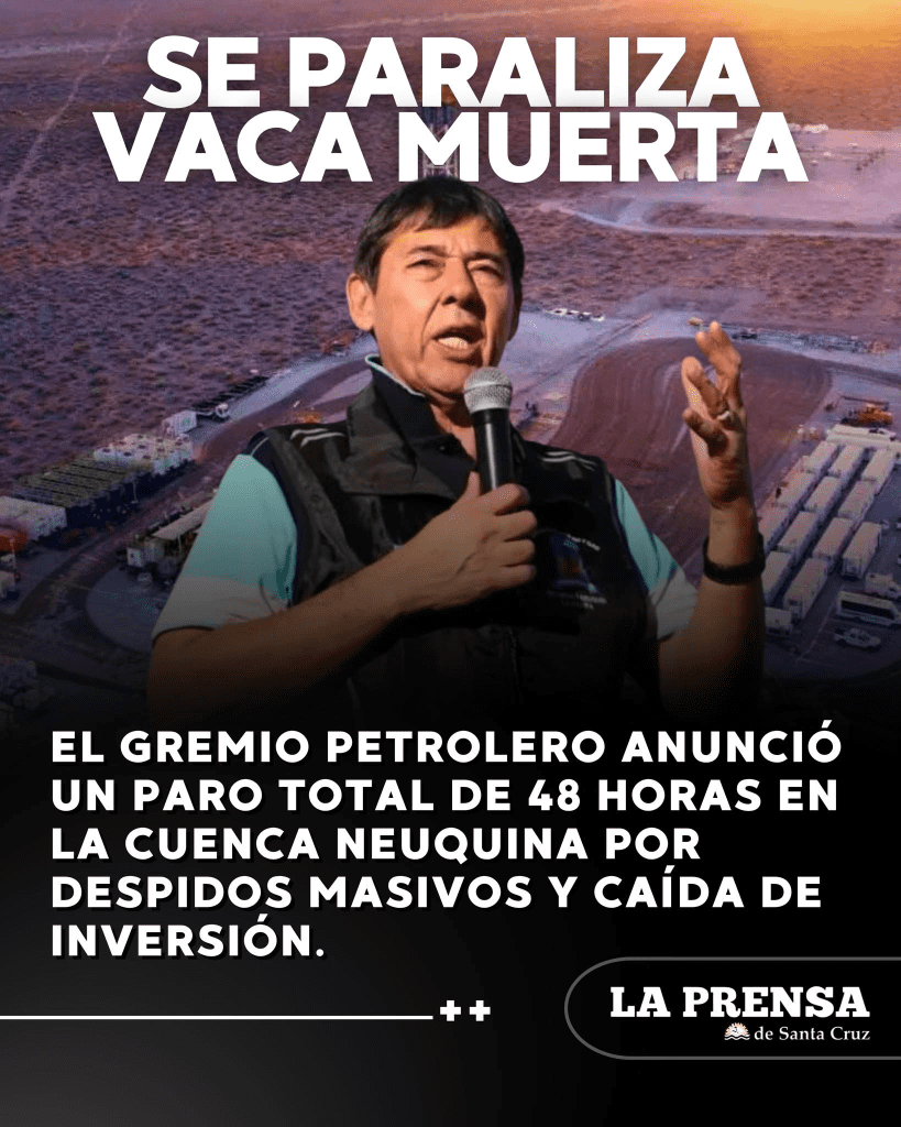 Vaca Muerta, la mayor apuesta energética del país, se detendrá por completo la próxima semana. El Sindicato de Petróleo y Gas Privado de Río Negro, Neuquén y La Pampa anunció un paro general de actividades por 48 horas a raíz de una ola de despidos y suspensiones que afecta a miles de trabajadores en la cuenca. La medida comenzará el miércoles 30 de julio a las 20:00, en el recambio de turnos, y se extenderá hasta el viernes 1 de agosto.
