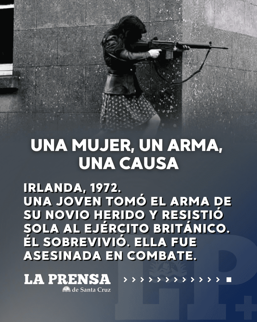 La imagen fue captada en Irlanda en 1972, en uno de los tantos enfrentamientos entre las fuerzas republicanas y el ejército británico. En ella se ve a una joven empuñando el arma de su novio herido, defendiéndose sola frente a un pelotón inglés. Él sobrevivió. Ella no. Pero su gesto, su determinación, y su entrega quedaron grabadas para siempre.