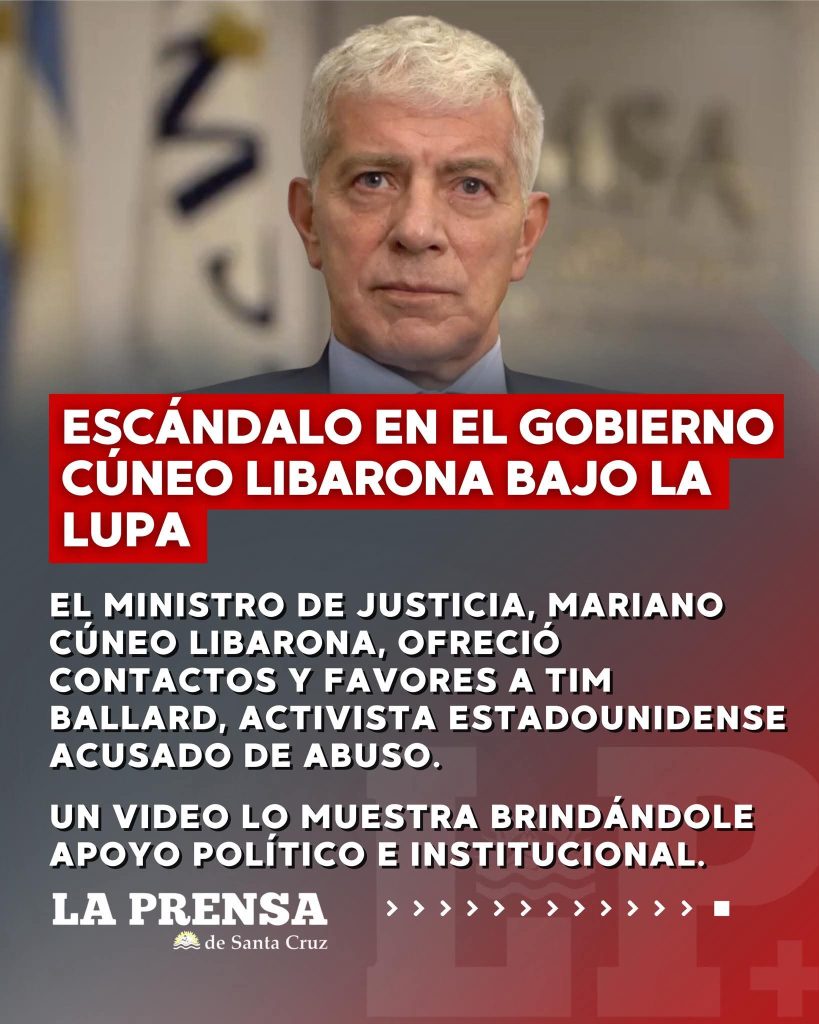 El ministro de Justicia de la Nación, Mariano Cúneo Libarona, quedó en el ojo de la tormenta tras la difusión de un video grabado con cámara oculta que lo muestra manteniendo una reunión en Nueva York con Tim Ballard, exagente federal estadounidense acusado de abuso sexual, trata de personas y fraude, y cuya figura inspiró la película “Sonido de Libertad”. En las imágenes, que rápidamente se viralizaron en redes sociales, se ve al funcionario ofreciendo contactos políticos, respaldo mediático y hasta una ley “a medida” para favorecer los intereses del activista norteamericano.