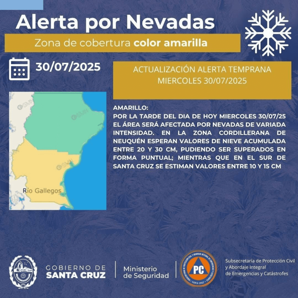 La Subsecretaría de Protección Civil informa que el Servicio Meteorológico Nacional ha emitido una Alerta Amarilla por nevadas y lluvias que afectarán distintos sectores de la provincia de Santa Cruz durante la jornada de hoy.