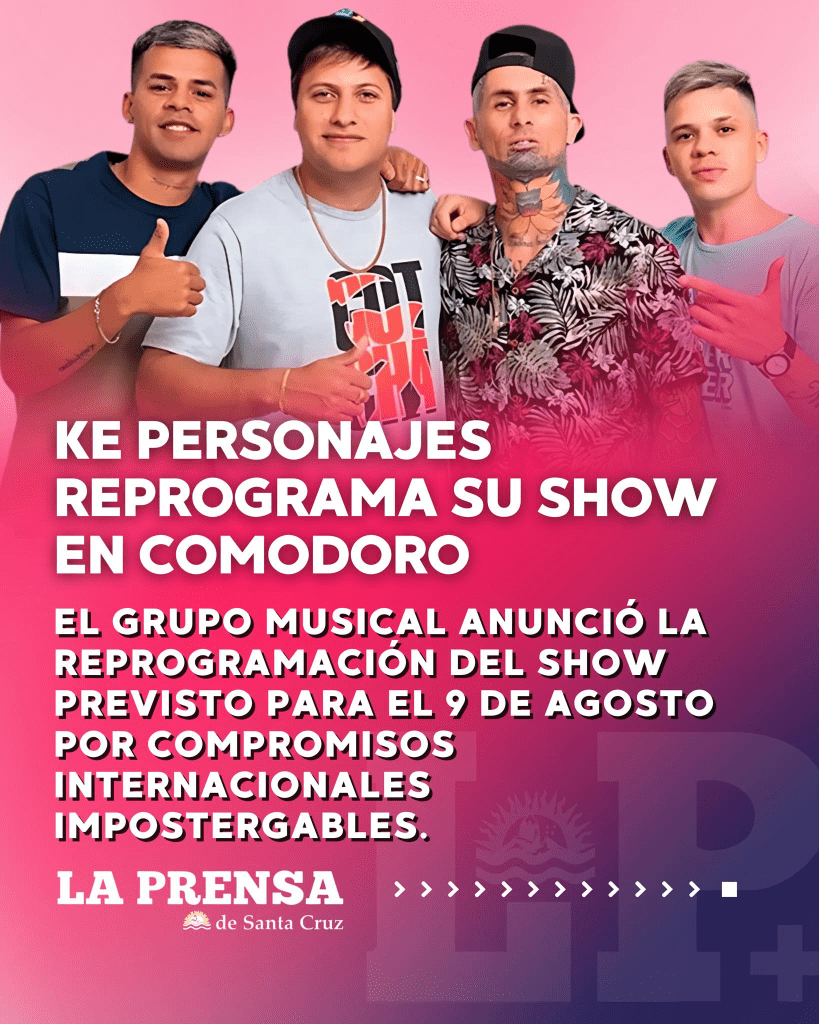 El reconocido grupo musical Ke Personajes anunció la reprogramación de su esperado show en Comodoro Rivadavia debido a compromisos internacionales impostergables. La presentación, originalmente prevista para el 9 de agosto, fue trasladada al próximo 18 de octubre.