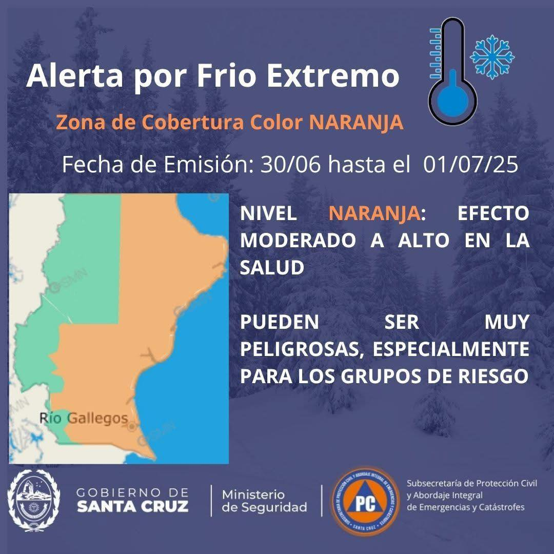 ALERTA POR TEMPERATURAS EXTREMAS DE FRÍO – NIVEL NARANJA, VIGENTE DESDE HOY, LUNES 30/06/2025, HASTA EL DÍA MARTES 01/07/2025, EMITIDA