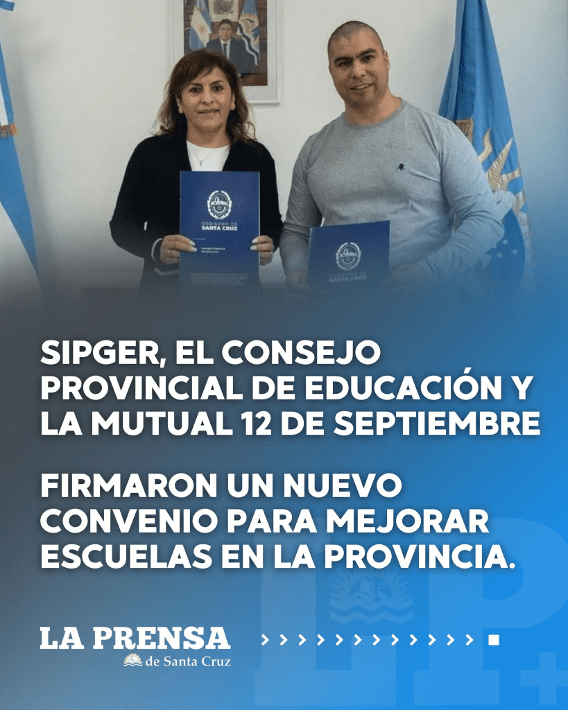 El Sindicato del Petróleo, Gas Privado y Energías Renovables (SIPGER), la Mutual 12 de Septiembre y el Consejo Provincial de Educación (CPE) firmaron un nuevo convenio con el objetivo de fortalecer el sistema educativo santacruceño a través de acciones concretas de mantenimiento, infraestructura y articulación pedagógica.