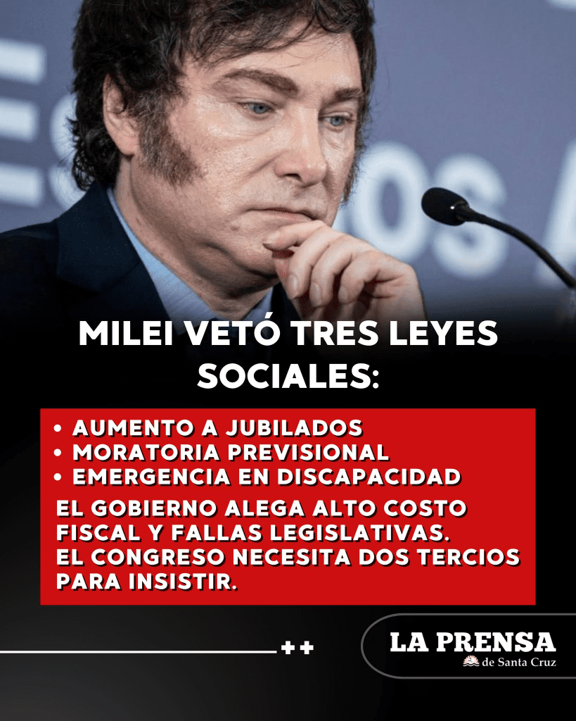 El presidente Javier Milei oficializó este lunes el veto total a tres leyes de fuerte contenido social que habían sido aprobadas por el Congreso de la Nación: el aumento de emergencia para jubilados, la reinstauración de la moratoria previsional y la declaración de emergencia en discapacidad. La medida fue publicada en el Boletín Oficial mediante el decreto 534/2025.