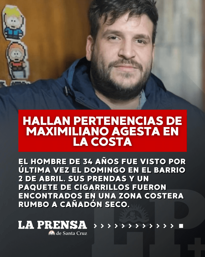 La ciudad de Caleta Olivia se encuentra movilizada por la desaparición de Maximiliano Agesta, un vecino de 34 años cuya última aparición registrada fue el domingo 10 de agosto. Desde entonces, familiares, vecinos y fuerzas de seguridad trabajan de manera coordinada para localizarlo. El hallazgo de algunas de sus pertenencias en un sector costero ha intensificado las tareas de rastrillaje.