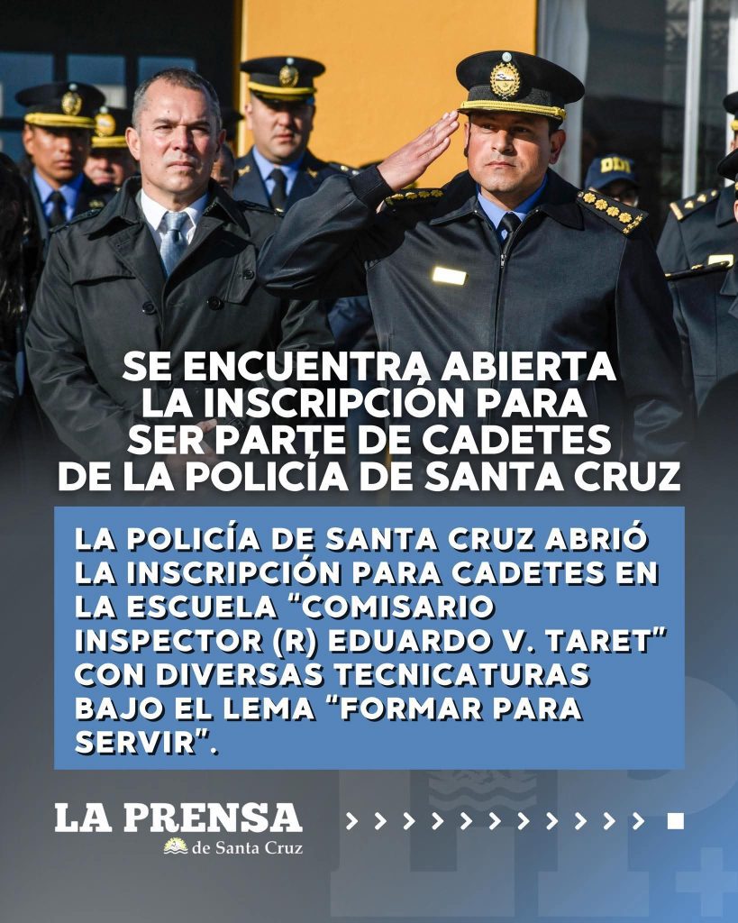 Desde el Departamento Escuela de Cadetes “Comisario Inspector (R) Eduardo V. Taret”, dependiente de la Policía Provincial de Santa Cruz, se informó que se encuentra disponible el formulario de inscripción que permitirá, a quienes cumplan con los requisitos, ser parte de la fuerza provincial.