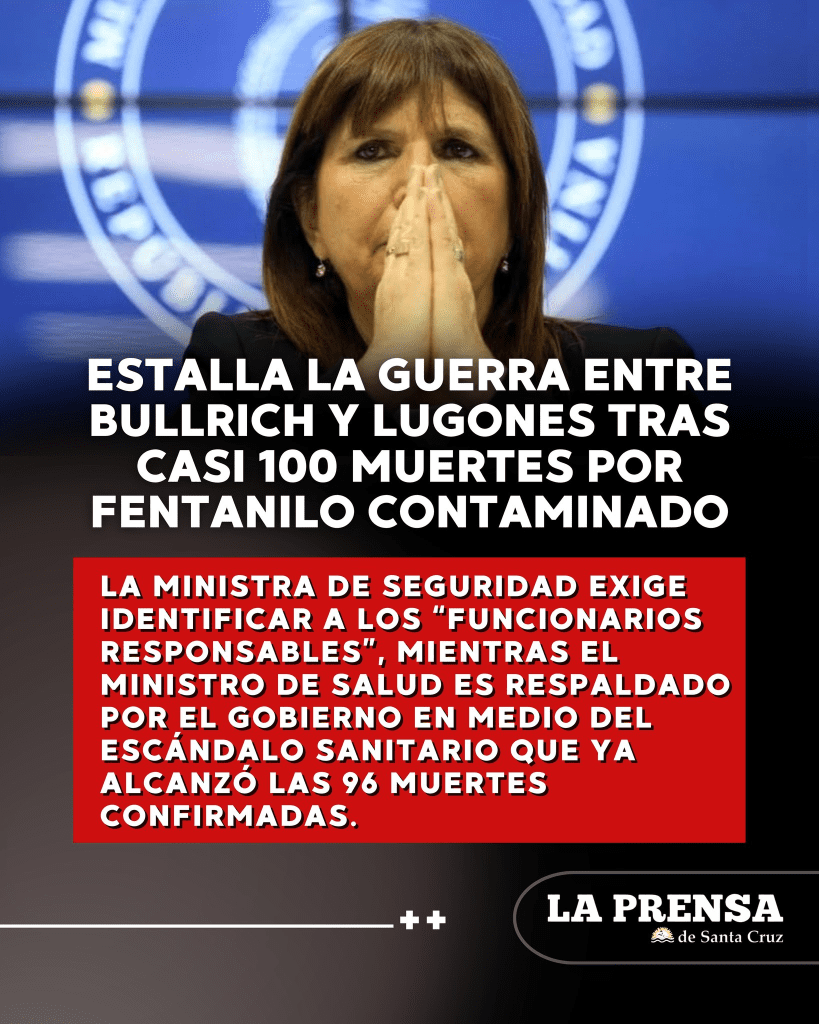 Una feroz disputa política se ha desatado en el seno del gobierno libertario, tras confirmarse que al menos 96 personas murieron en Argentina por la administración de fentanilo clínico contaminado con bacterias multirresistentes. El foco actual está en dilucidar responsabilidades: Patricia Bullrich reclama investigar la cadena de custodia y a los funcionarios responsables, mientras el gobierno cierra filas en defensa de Mario Lugones, su ministro de Salud.