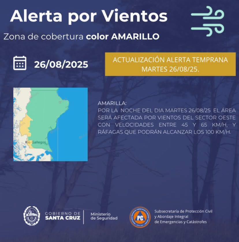 ACTUALIZACIÓN ALERTA TEMPRANA AMARILLA POR VIENTOS El Servicio Meteorológico Nacional emitió un aviso para el día martes 26 de agosto