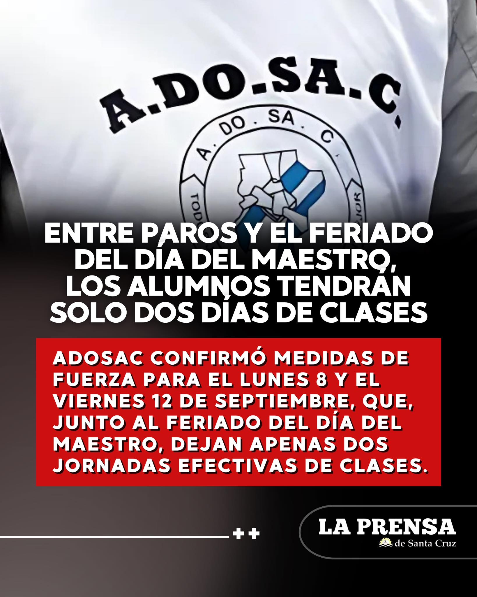Adosac confirmó medidas de fuerza para el lunes 8 y el viernes 12 de septiembre. A ello se suma el