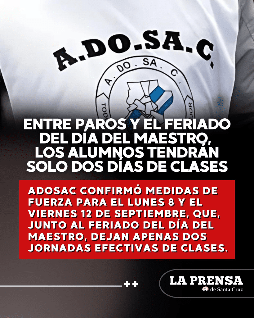 La próxima semana, la actividad escolar en Santa Cruz volverá a verse fuertemente reducida. La Asociación de Docentes de Santa Cruz (Adosac) resolvió convocar a paros para el lunes 8 y el viernes 12 de septiembre, en el marco de un plan de lucha que se sostiene desde principios de año.