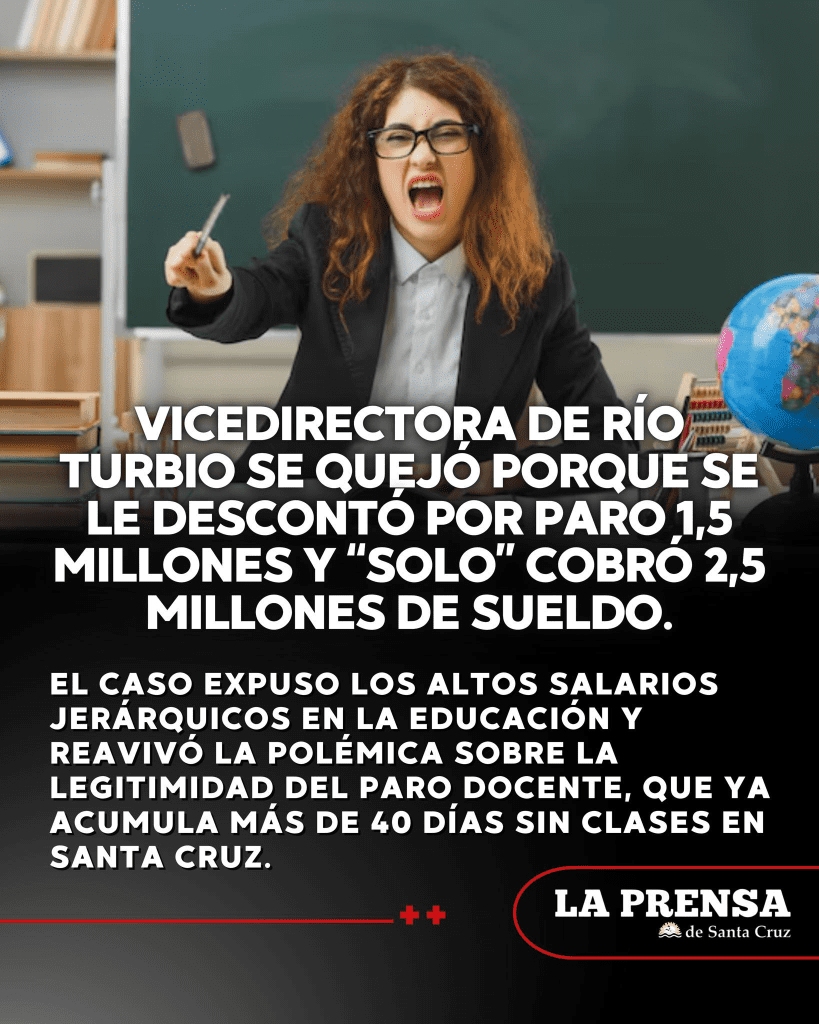 El reclamo de una vicedirectora por los descuentos aplicados a su salario volvió a encender la polémica en Santa Cruz. Mientras miles de estudiantes llevan más de 40 días sin clases, la docente denunció públicamente que su bolsillo se redujo a “apenas” 2,5 millones de pesos, pese a percibir un sueldo bruto cercano a los 5 millones.