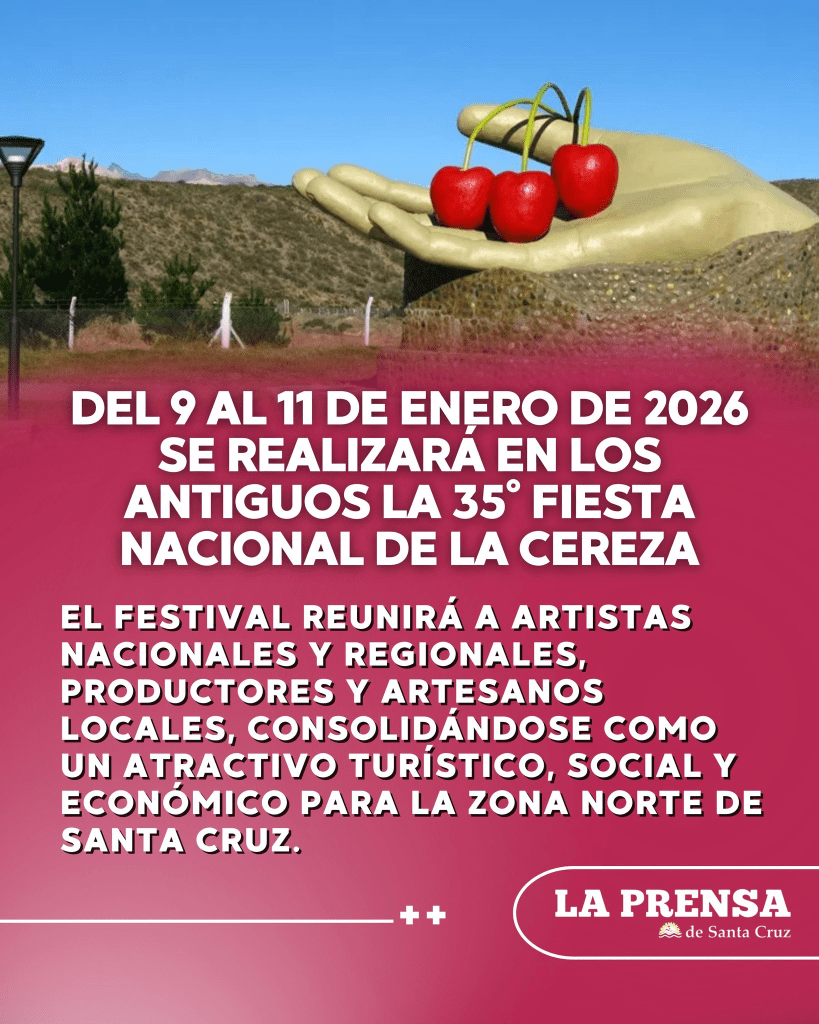 Del 9 al 11 de enero de 2026 se realizará la 35° edición de la Fiesta Nacional de la Cereza en Los Antiguos.