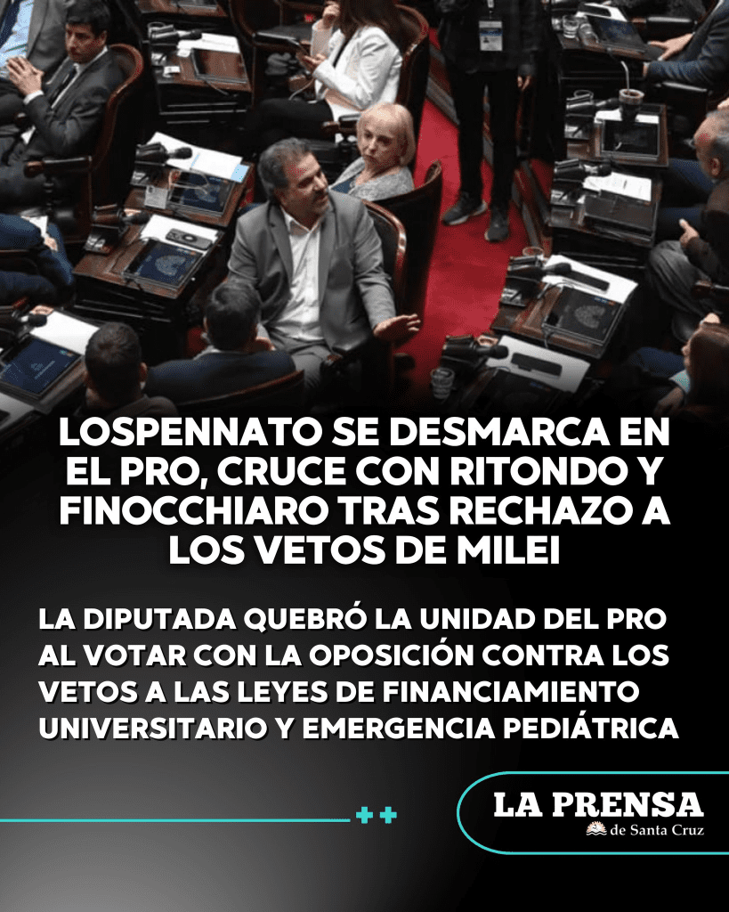 Silvia Lospennato rompió la unidad del bloque PRO al votar junto a la oposición en Diputados el rechazo de los vetos presidenciales a las leyes de Financiamiento Universitario y Emergencia Pediátrica (Garrahan), lo que desató un fuerte enfrentamiento con Cristian Ritondo, jefe de bloque, y Alejandro Finocchiaro.