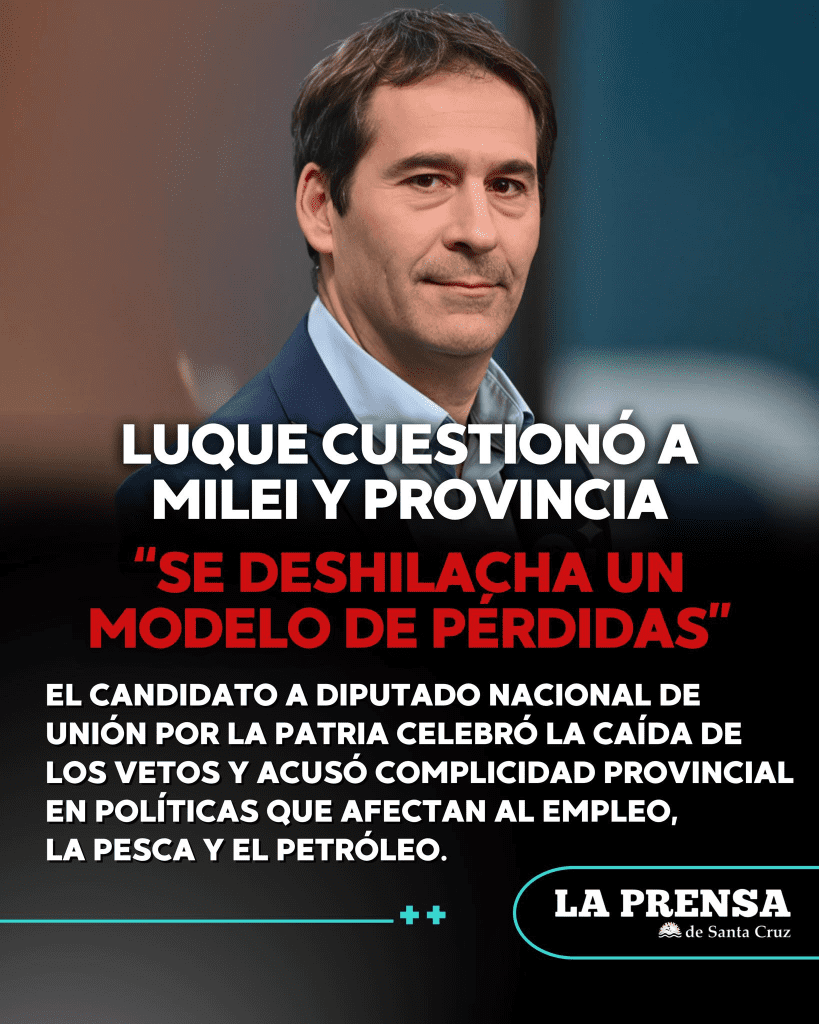 En medio de la movilización universitaria que tuvo lugar este jueves en Comodoro Rivadavia, Juan Pablo Luque, candidato a diputado nacional por Unión por la Patria, tomó la palabra para referirse al presente político y económico del país. En su intervención, celebró la reciente caída de los vetos presidenciales en el Congreso y advirtió sobre lo que calificó como un “deshilachamiento” de la gestión de Javier Milei.