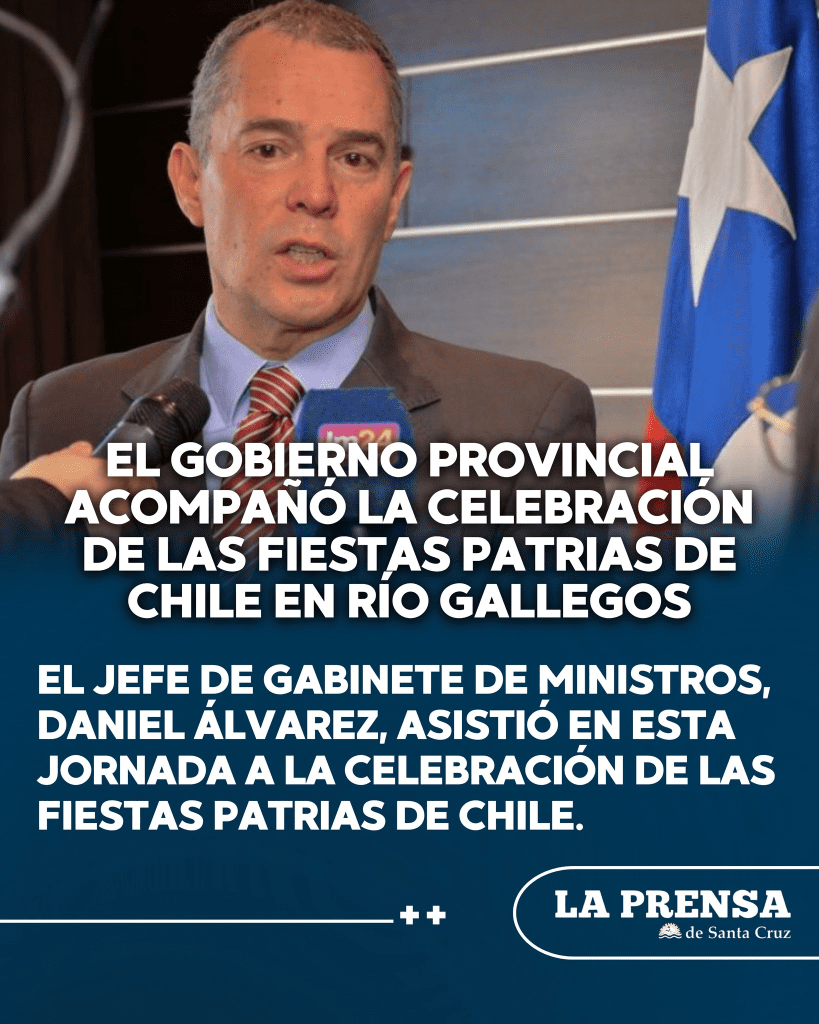 El jefe de Gabinete de Ministros, Daniel Álvarez, asistió en esta jornada a la celebración de las Fiestas Patrias de Chile, acontecimiento que conmemora la Primera Junta Nacional de Gobierno de 1810, que marcó el inicio del camino hacia la independencia del vecino país. La misma tuvo lugar en el Hotel Patagonia de la ciudad de Río Gallegos.