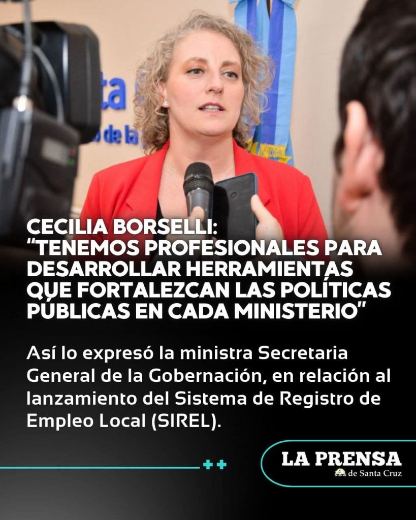 “Estamos colaborando con el Ministerio de Trabajo, Empleo y Seguridad Social con respecto a una solicitud para la creación de esta herramienta”, explicó la ministra Secretaria General de la Gobernación, Cecilia Borselli, respecto a la implementación del Sistema de Registro de Empleo Local (SIREL) para que las empresas, contratistas y subcontratistas privadas que operan en la provincia puedan registrar su información institucional y la de su personal.
