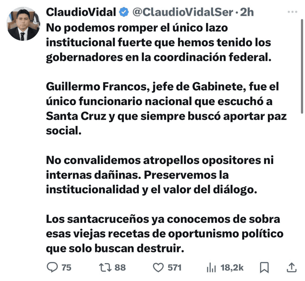 El gobernador de Santa Cruz, Claudio Vidal, utilizó su cuenta oficial de X para remarcar la necesidad de resguardar los canales de diálogo institucional entre las provincias y el Gobierno Nacional.