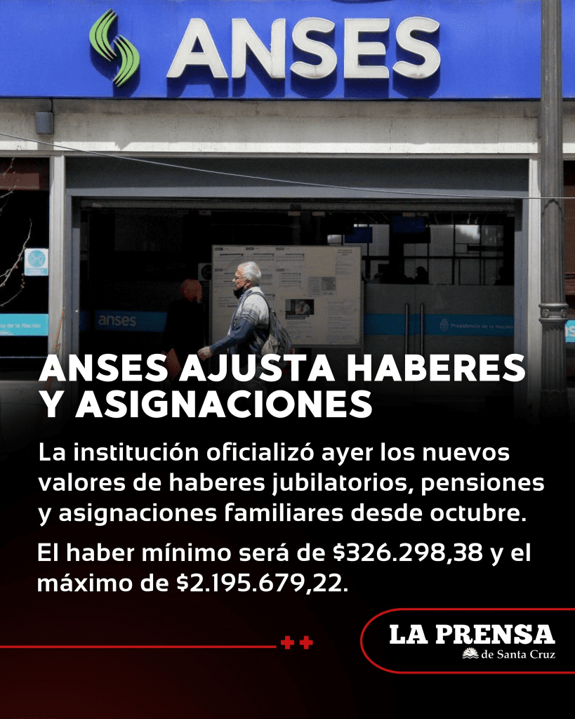 La Administración Nacional de la Seguridad Social (ANSES) oficializó ayer los valores que regirán desde octubre para los haberes jubilatorios, pensiones y asignaciones familiares, conforme lo dispuesto por la normativa vigente de movilidad. El organismo fijó el haber mínimo en $326.298,38 y el máximo en $2.195.679,22.