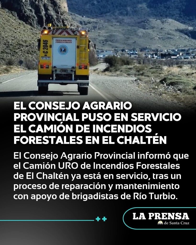 El Consejo Agrario Provincial informa que el Camión URO de Incendios Forestales asignado a la localidad de El Chaltén ya se encuentra en servicio, luego de un proceso de reparación y mantenimiento realizado con el apoyo del personal y brigadistas de la delegación Río Turbio.