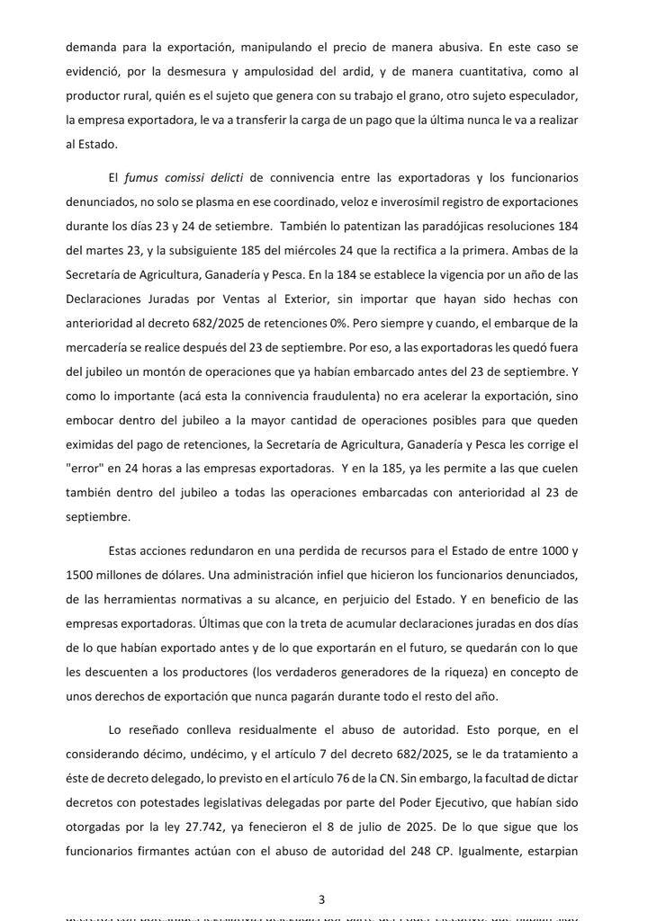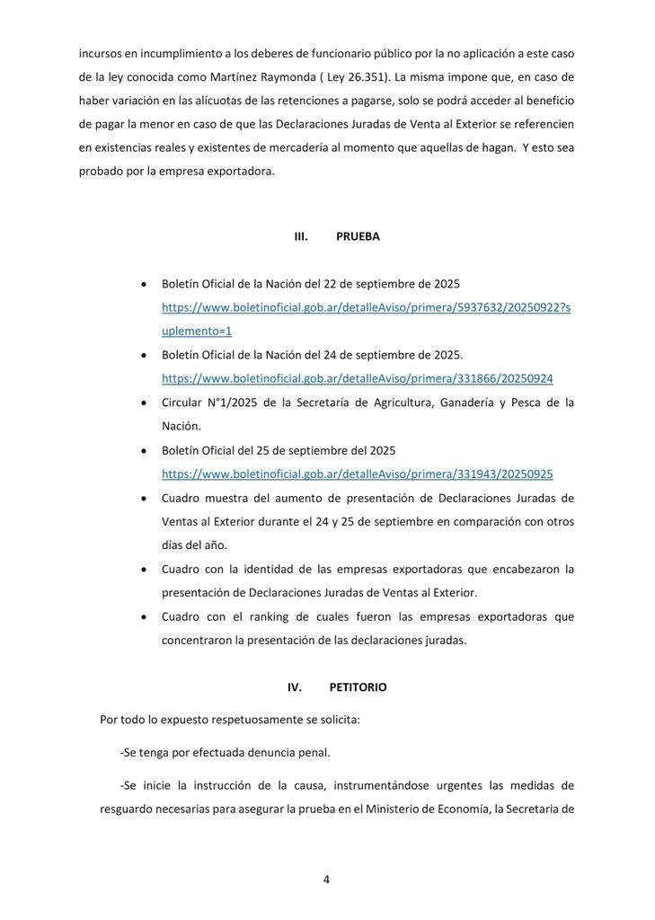 Denunciaron penalmente al presidente Javier Milei, al jefe de gabinete Guillermo Francos, al ministro de Economía Luis Caputo y al secretario de Agricultura, Ganadería y Pesca, Sergio Iraeta.