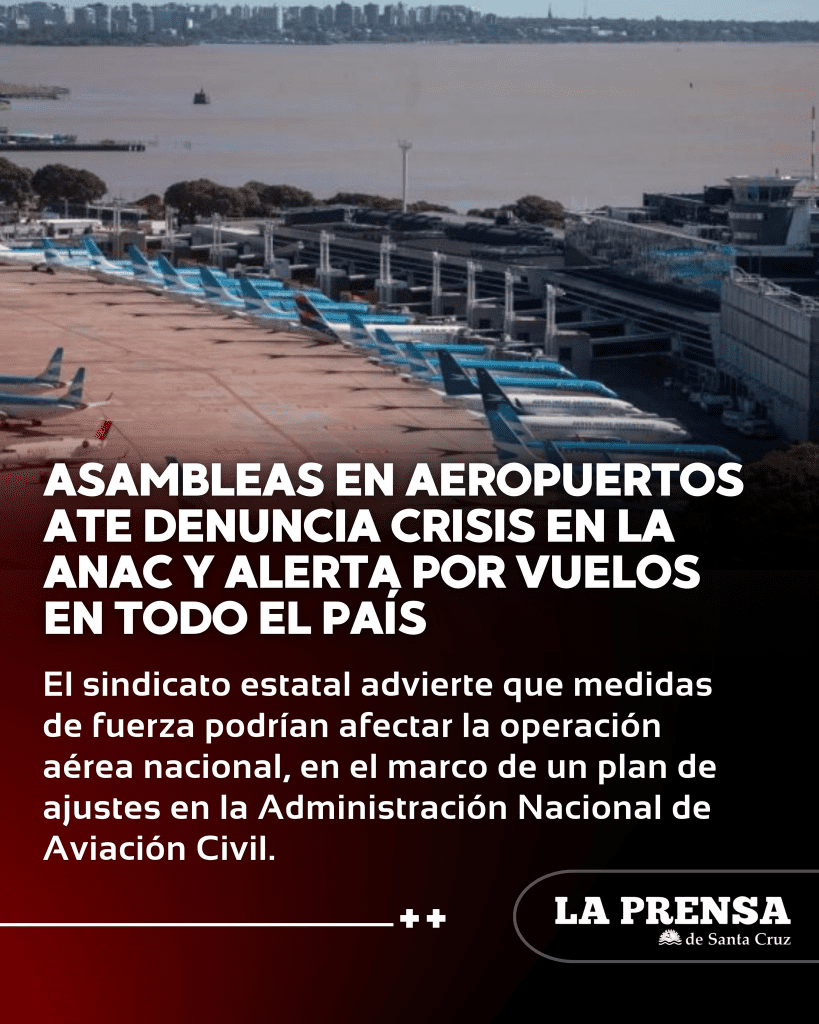 La Asociación de Trabajadores del Estado (ATE) convocó a asambleas y protestas en los aeropuertos de todo el país para denunciar un quadro crítico en la Administración Nacional de Aviación Civil (ANAC), que —afirman los trabajadores— podría poner en riesgo el normal funcionamiento de los vuelos comerciales. La denuncia se fundamenta en un documento oficial según el cual el organismo prevé recortar más del 50 % de su planta de personal, mediante despidos, pases a disponibilidad, jubilaciones y traslados internos.