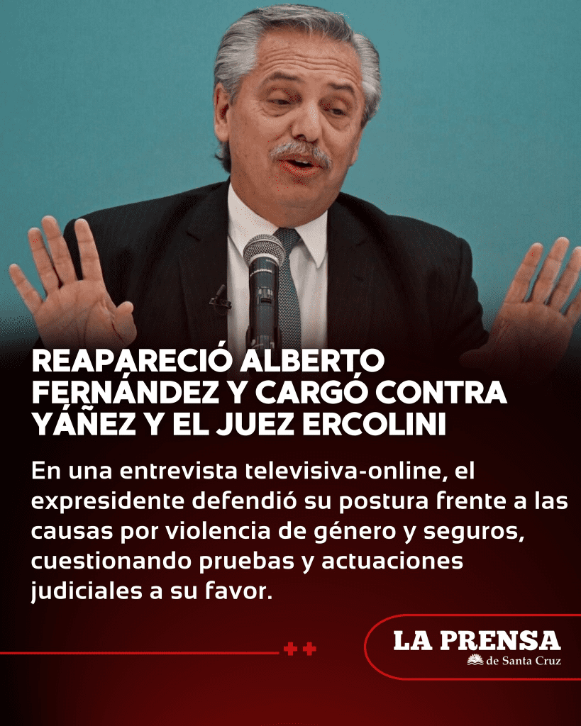 El expresidente Alberto Fernández reapareció públicamente este fin de semana mediante una entrevista por streaming, en la que retomó dos de los expedientes judiciales que lo afectan: la denuncia de violencia de género formulada por su expareja, Fabiola Yáñez, y la causa por negociaciones incompatibles en el área de los seguros. En ese marco, apuntó fuertemente contra Yáñez y el juez federal Julián Ercolini, cuestionando la validez de los testimonios y las decisiones procesales.