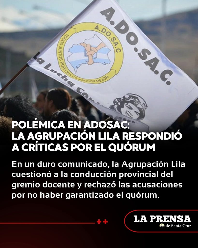 La interna gremial en la Asociación de Docentes de Santa Cruz (ADOSAC) sumó un nuevo capítulo con la difusión de un comunicado de la Agrupación Lila, que salió al cruce de la conducción provincial tras las críticas por no haber aportado el quórum suficiente para sostener el último congreso sindical.