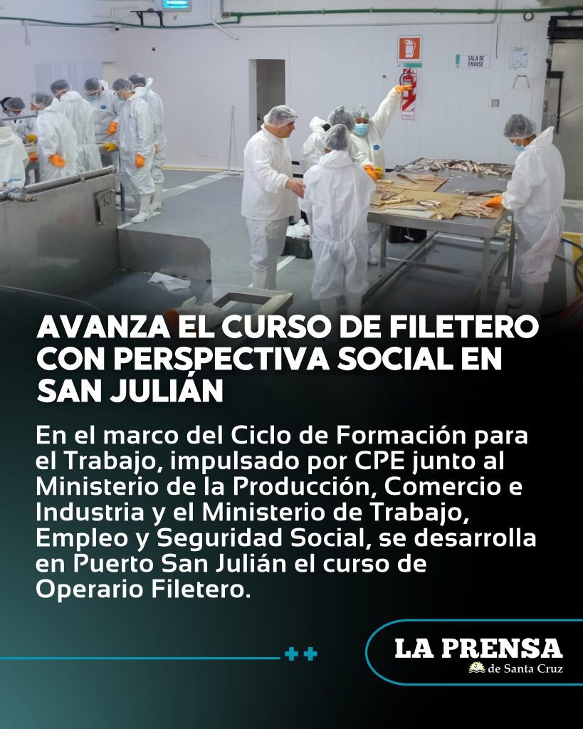 En el marco del Ciclo de Formación para el Trabajo, impulsado por el Consejo Provincial de Educación (CPE) junto al Ministerio de la Producción, Comercio e Industria y el Ministerio de Trabajo, Empleo y Seguridad Social, se desarrolla en Puerto San Julián el curso de Operario Filetero, una propuesta formativa que promueve la capacitación laboral en la actividad pesquera.