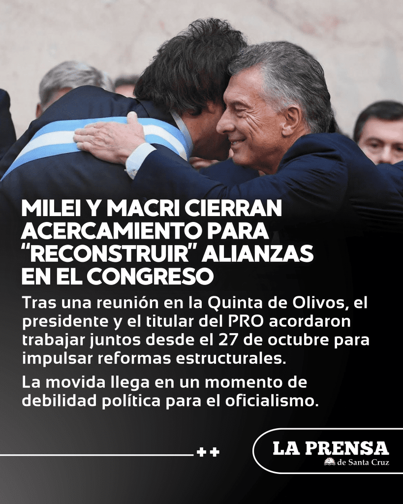 Este acercamiento entre Milei y Macri marca un momento político de inflexión. No sólo refleja un esfuerzo por recomponer vínculos en medio de una crisis parlamentaria, sino también una apuesta estratégica rumbo a un nuevo reparto de poder, donde la derecha aspira a consolidar su espacio frente al kirchnerismo. El desafío ahora es que ese acuerdo sobreviva más allá de las declaraciones mediáticas, y que se traduzca en real respaldo legislativo.
