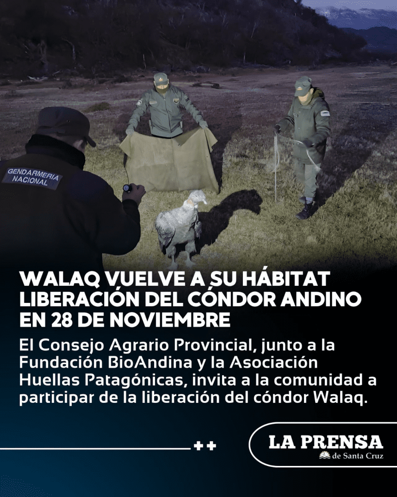 El Consejo Agrario Provincial, junto a la Fundación BioAndina y la Asociación Huellas Patagónicas, invita a la comunidad a participar de la liberación del cóndor Walaq, que se realizará el jueves 9 de octubre a las 10:30 en el Mirador de Cóndores de 28 de Noviembre.
