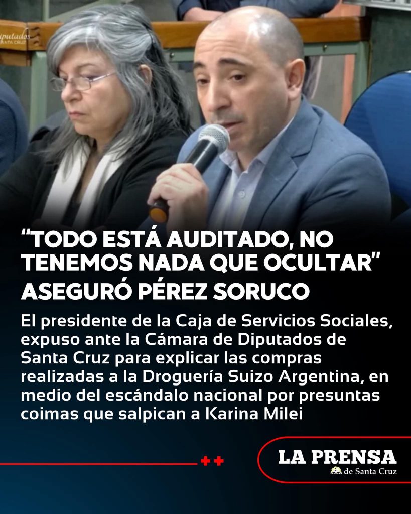 El titular de la Caja de Servicios Sociales (CSS), Sergio Pérez Soruco, se presentó este jueves junto a su equipo directivo ante la Cámara de Diputados de Santa Cruz, luego del pedido de informes sobre las compras realizadas a la Droguería Suizo Argentina S.A., en el marco de un escándalo nacional que involucra presuntas coimas y vínculos con Karina Milei.