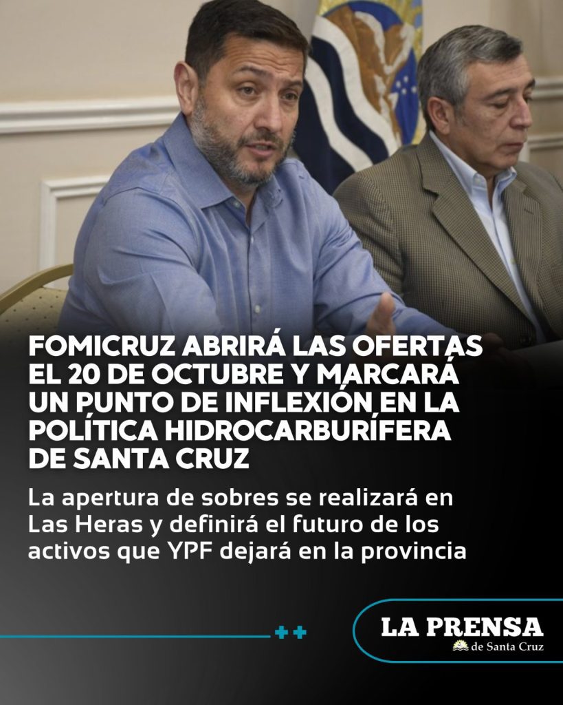 El próximo lunes 20 de octubre, en la localidad de Las Heras, se concretará la apertura de ofertas para la licitación de los activos hidrocarburíferos que YPF dejará en Santa Cruz. El proceso, encabezado por Fomento Minero de Santa Cruz Sociedad del Estado (FOMICRUZ S.E.), es considerado por su presidente, Oscar Vera, como “un punto de inflexión en la política hidrocarburífera de la provincia” y una oportunidad estratégica para redefinir el desarrollo energético en la región norte.