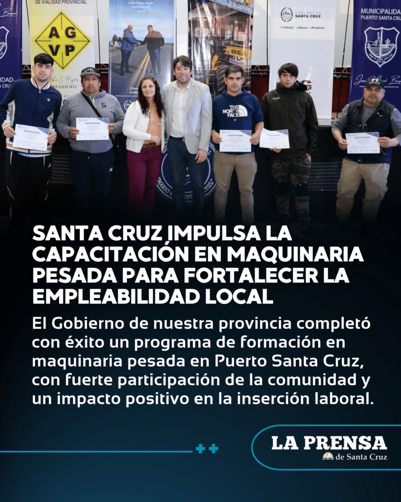 El Gobierno de nuestra provincia completó con éxito un programa de formación en maquinaria pesada en Puerto Santa Cruz, con fuerte participación de la comunidad y un impacto positivo en la inserción laboral.