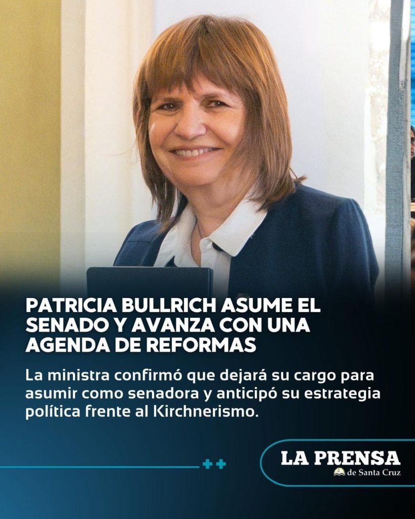 Patricia Bullrich anunció que el próximo 10 de diciembre dejará la cartera de Seguridad para asumir como senadora nacional por la Ciudad de Buenos Aires. La dirigente aseguró que su objetivo es “impulsar reformas que permitan simplificar la economía, reducir la carga impositiva y modernizar el marco legal y laboral argentino”. Entre sus prioridades mencionó la actualización del Código Penal, la reforma del sistema laboral y medidas orientadas a favorecer la inversión y la actividad productiva.