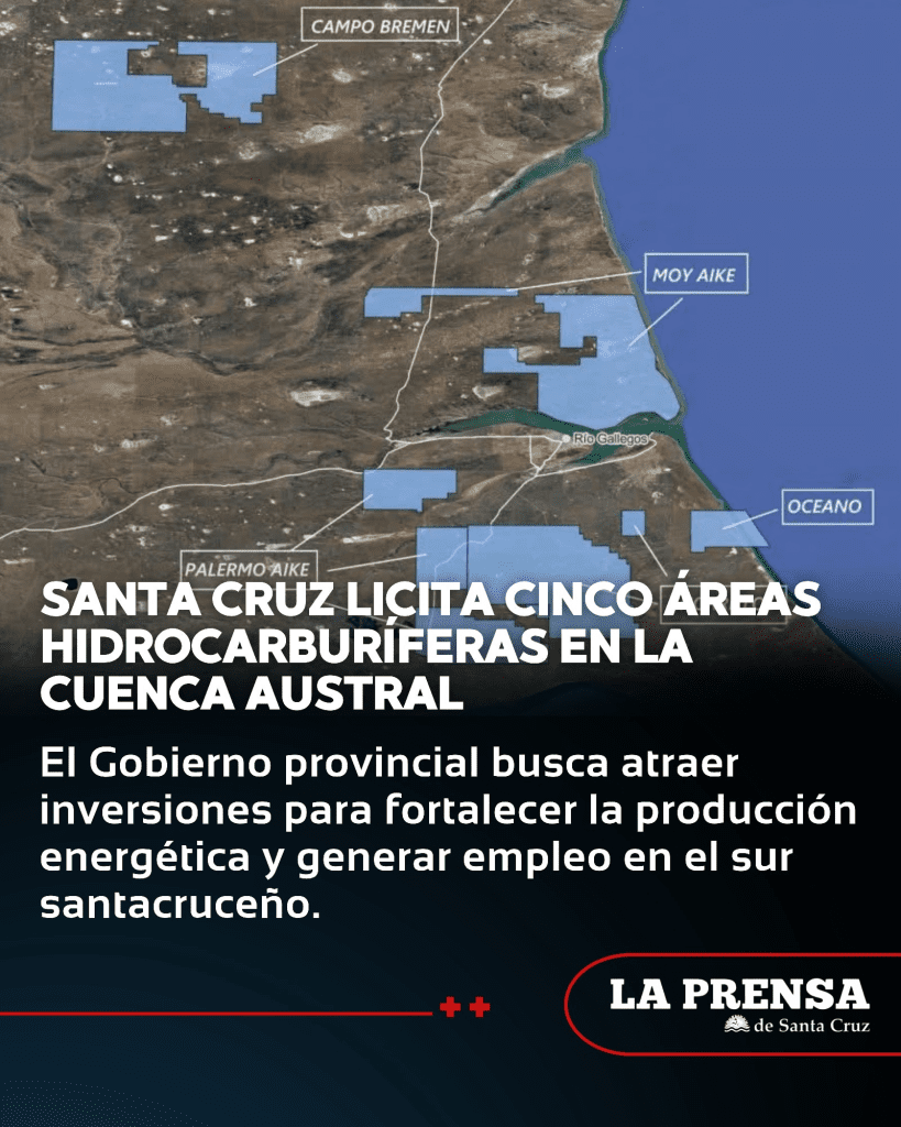 El Gobierno de Santa Cruz, a través del Ministerio de Energía y Minería, anunció el lanzamiento de una Licitación Pública Nacional e Internacional para la explotación de hidrocarburos en cinco áreas estratégicas de la Cuenca Austral. Se trata de los bloques Océano, Chorrillos, Palermo Aike, Campo Bremen y Moy Aike, zonas de larga trayectoria en materia productiva y con un alto potencial de recuperación.