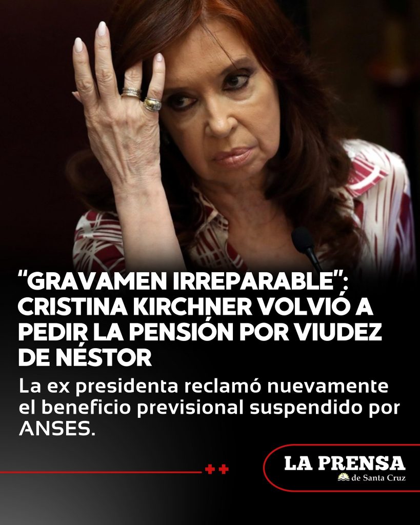 Cristina Fernández de Kirchner presentó un nuevo recurso ante la Justicia para recuperar la pensión por viudez correspondiente a Néstor Kirchner, asegurando que la negativa al pago le provoca “un gravamen irreparable” y vulnera derechos previsionales. Su defensa solicita que se habilite el cobro de manera provisoria mientras avanza el trámite judicial.