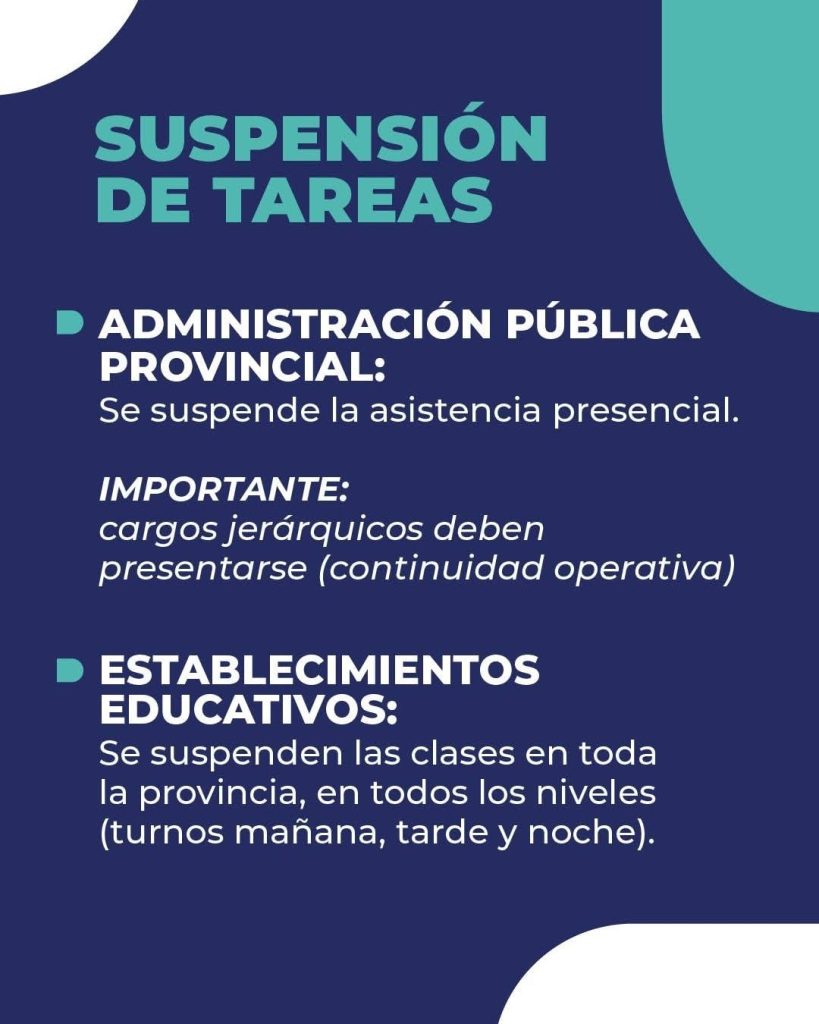 “Quedan suspendidas todas las actividades escolares en los establecimientos educativos, en todos los niveles y turnos”, indicaron desde el Gobierno, solicitando a las familias evitar traslados y mantenerse informadas a través de los canales oficiales.