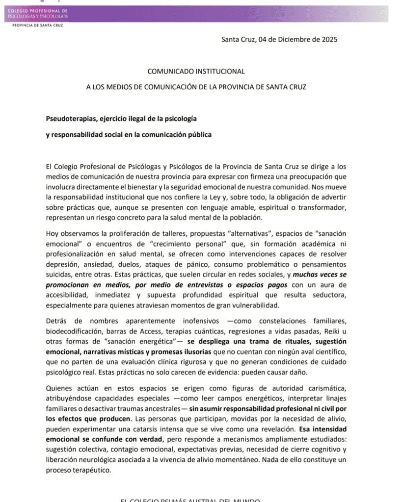 El Colegio Profesional de Psicólogas y Psicólogos de Santa Cruz difundió un comunicado dirigido a los medios provinciales para advertir sobre el crecimiento de pseudoterapias y propuestas de “sanación emocional” o “crecimiento personal” que carecen de sustento académico.