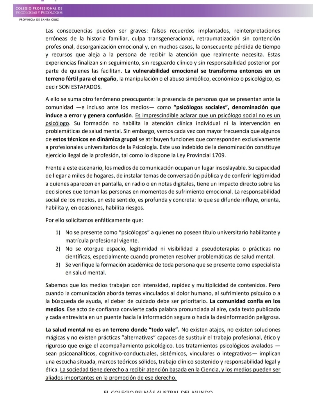 También aclaró que la figura del “psicólogo social” no habilita la atención clínica, y que utilizar esa denominación para ofrecer servicios terapéuticos constituye “ejercicio ilegal de la profesión”, de acuerdo con la Ley Provincial 1709.