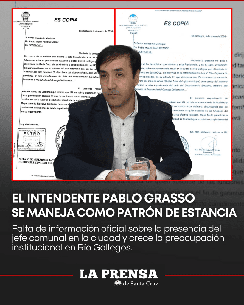 Río Gallegos atraviesa una situación institucional delicada que no puede ser minimizada ni naturalizada. La falta de información clara y oficial respecto a la presencia del intendente Pablo Grasso en la ciudad o incluso en el territorio provincial ha encendido alertas en distintos ámbitos, no por una disputa política, sino por el impacto directo que esta indefinición tiene sobre el funcionamiento regular del Municipio y la validez de los actos de gobierno.