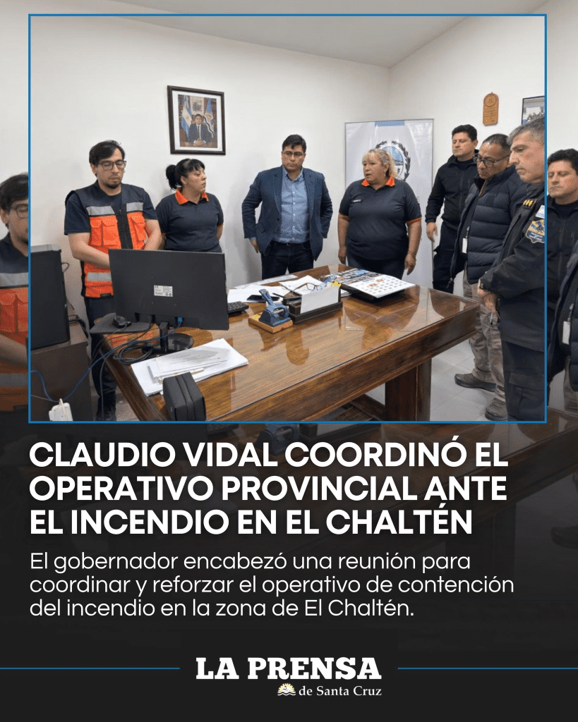 El gobernador de Santa Cruz, Claudio Vidal, encabezó una reunión de trabajo para coordinar acciones frente al incendio forestal registrado en la zona del Parque Nacional Los Glaciares, en cercanías de la localidad de El Chaltén.